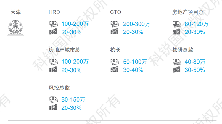 天津整体薪资呈现上涨的趋势,尤其金融、教育、高科技等行业,核心岗位如在线教育的教学教研岗、AI算法、底层开发架构等岗位跳槽涨幅可达30-50%。本数据来源于猎头公司凯发K8国际资深行业专家对2021年热门职位薪酬范围及跳槽涨幅的预测,供HR和猎头招聘参考。